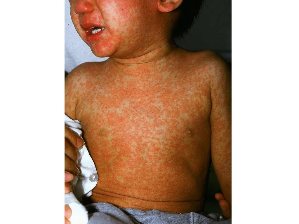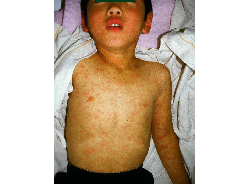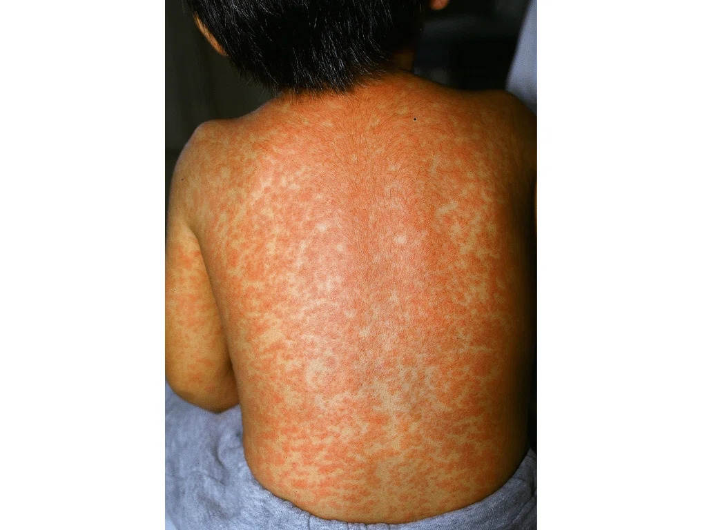 その頃から発疹(ブツブツ)が出てきます。発疹は耳の後ろから始まり次第に全身に広がります。