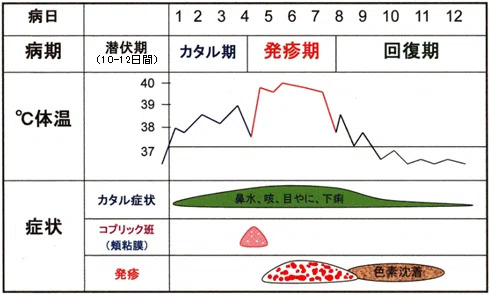 まず熱や咳、鼻汁、めやになどで始まり、目の充血や口の粘膜の発赤などが目立ちます。口の中の粘膜に白いブツブツ(コプリック斑)が見られることもあります。